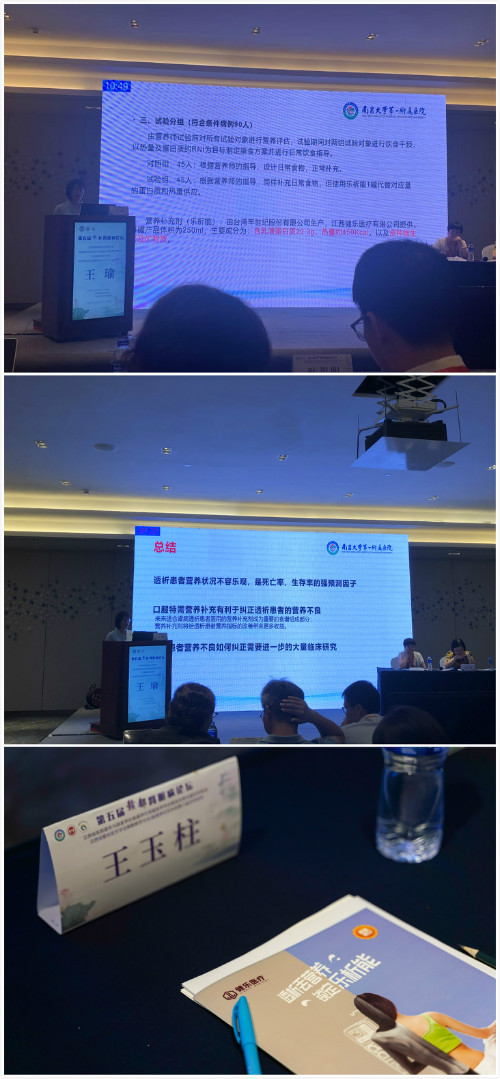 本次大會,我司有幸獲邀參展,并由南昌大學第一附屬醫院腎內科王瑜副主任醫師就“樂析能營養治療干預血液透析患者蛋白質能量消耗的作用”進行了專題報告。報告中指出:通過多中心臨床實驗證明,樂析能?有利于改善透析患者蛋白質能量消耗問題,為透析患者出現的營養不良的干預治療提供了新的途徑。